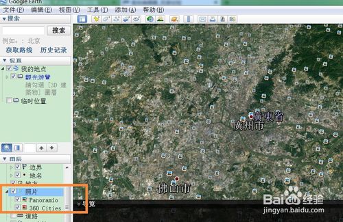 左侧侧栏,找到【照片】勾选项,勾空则可以成功去除卫星地图上的照片图标。展开【照片】项,我们还是选择性去除【Panoramio】或【360 Cities】。