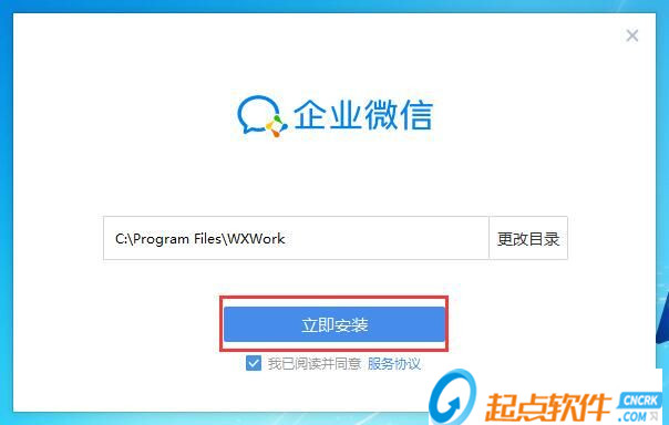 程序默认勾先我已阅读并同意服务协议,默认安装到C:\Program Files\WXWork,需要修改安装路径请点击[更改目录],然后点击立即安装。