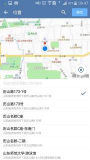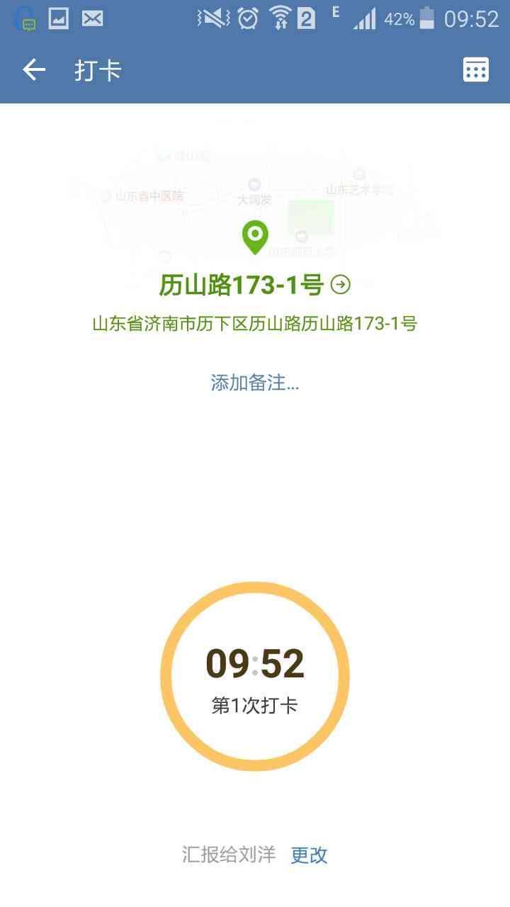 3,回到打卡界面,上方是定位,点开后可以选择300米范围之内的地点,选择目前所在的最准确的位置,点击右上方“确定”;再点击中间圆圈实时打卡,被汇报的同事能够马上收到打卡信息。