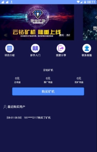 云钻矿机要怎么购买?第一步:在APP首页点击购买矿机