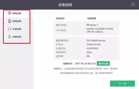 对于第一次安装使用ClassIn的用户,在登录教室前,ClassIn会帮助您对您的网络环境、以及音视频设备进行“体检”,以确保您能正常上课。