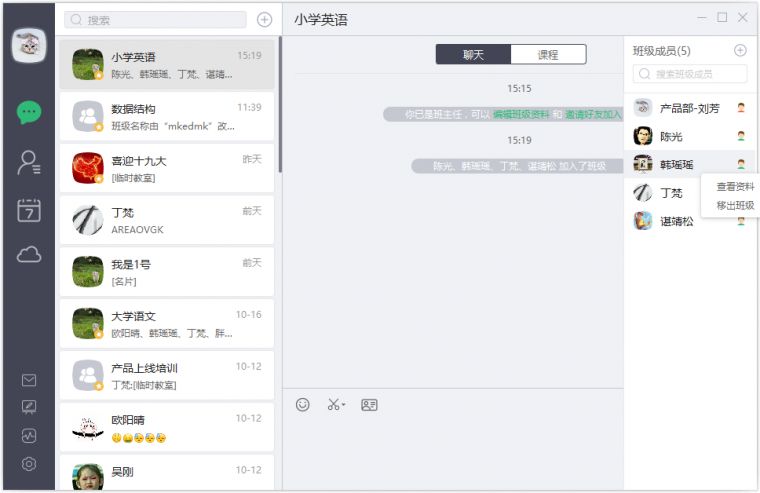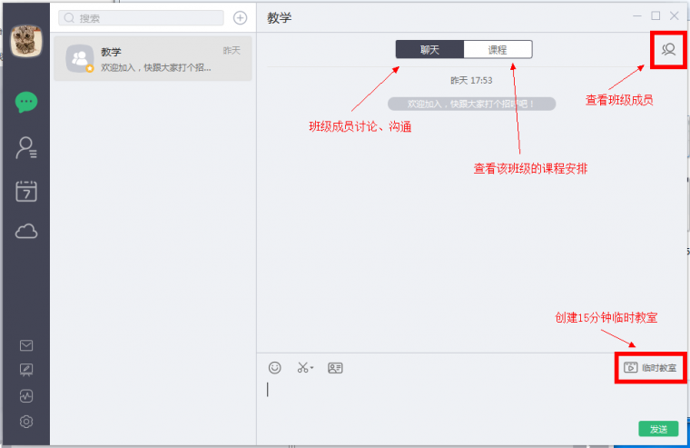 点击进入班级后,默认显示【聊天】界面,在班级中可查看全部成员和课程安排,每位成员都可创建15分钟的1v1临时教室。