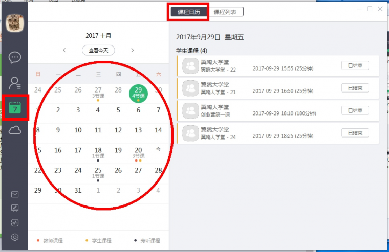 在左侧功能栏中选择【课程】,可查看目前已加入班级的全部课程,以日历形式标注清晰明了。