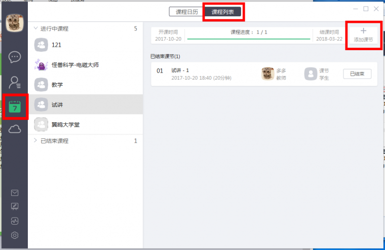 老师在【课程】中选择【课程列表】,可添加课节,方便快速开课。