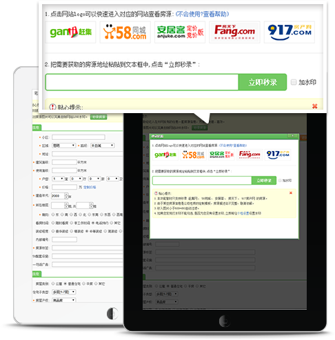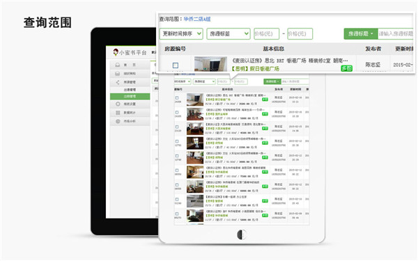 房产小蜜书为房产中介机构提供:房源管理,房源获取,房源一键群发,房源定时刷新,房源资源整合,二手房数据统计,小区透视分析, 中介模版, 组织架构管理,排班刷新,排班发布的管理系统。
