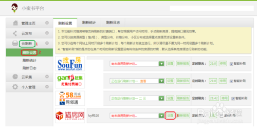小蜜书房产登录如何设置云刷新?登入小秘书主界面左侧依次找到>云刷新>刷新设置>选择您需要设置刷新的网站端口>设置.