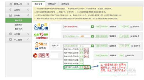 完成第5步保存后,系统会跳到刷新设置界面,找到我们刚才设置的刷新计划,点击启动。就表示我们的刷新计划已经启动.(需要提醒的是:云刷新设置后,取消网站预约和手动刷新,避免资源浪费)