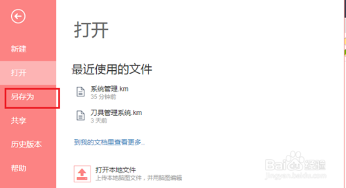 第三步进去设置界面之后,默认是打开,可以查看最近打开的文件,这里点击“另存为”,如下图所示: