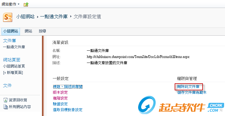 10、如果想要删除文件库,请在【文件库设定值】页面,选择权限与管理分类下的【删除此文件库】。