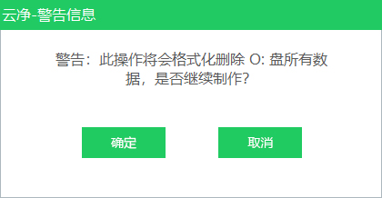 点击“开始制作”,这时会出现一个弹窗警告如下图,如果U盘中有重要资料需要先备份,点击确定开始制作所有数据都会被格式化删除。