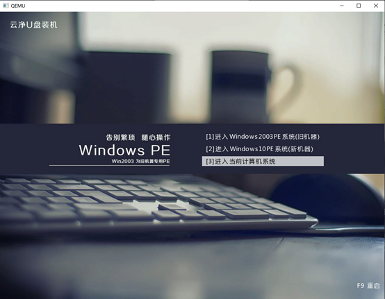 同样使用键盘的↑↓键选择PE系统,2008年前的电脑推荐使用2003PE,2008年后的电脑后选择Windows 10PE。选中后按下回车键就会进入PE系统。