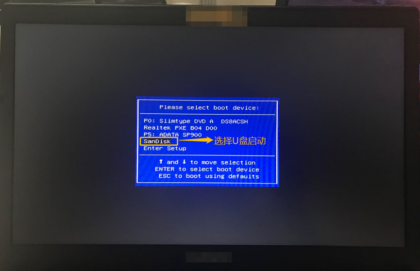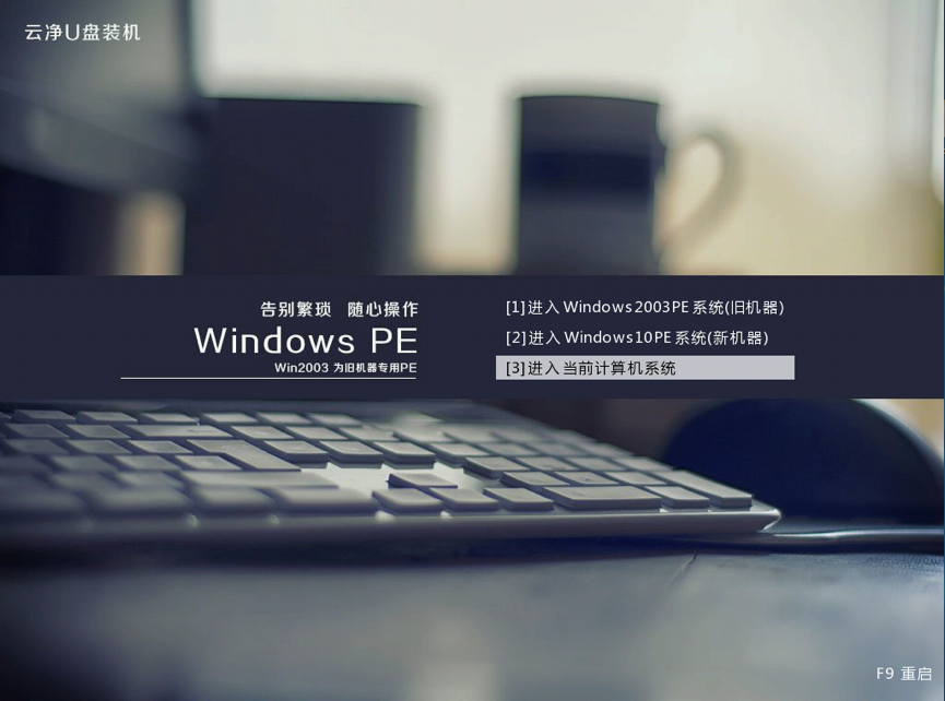 使用键盘的↑↓键选择您接入的U盘,然后按下回车键(Enter)按钮即可进入云净U盘工具菜单选择界面,如下图: