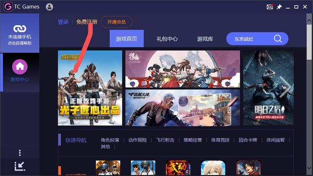 2、安装完成之后打开tcgames,点击电脑端的“免费注册”,如图: