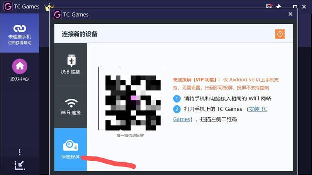 6、选择“快速投屏”,根据右端提示,按照步骤1把手机和电脑接入相同局域网;按照步骤2选项点击“安装tcgames”,扫描二维码安装tcgames手机端: