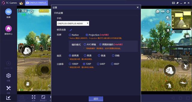 9、根据个人需求点击tcgames右端设置按钮对投屏游戏的画质、分辨率、亮度进行设置,主要在“手机设置”和“客户端设置”里面进行调试: