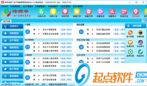 【提醒管理】主要针对生产,审核,收付款,配送,设备车辆,生日,回访等进行提醒。 生产到期提醒,安全巡检提醒;待审核单据提醒(采购计划、生产计划、销售订单、采购入库单、销售出库单、其他入库单、其他出库单、调拨单等);采购预定付款,销售预定收款,委托付款;车辆保险和年检到期、车辆需保养;设备需保养和需巡检;客户和员工生日提醒;回访提醒等。