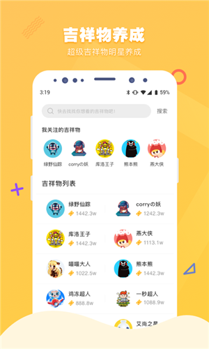 用户在吉祥大会app可以看到最受欢迎的吉祥物,可以关注自己喜欢的吉祥物,查看吉祥物的个人主页和动态。