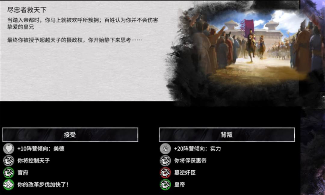 同盟也会影响你俘获天子时的抉择。相应地,该抉择的结果将决定你最终的派系等级是天子还是摄政王。