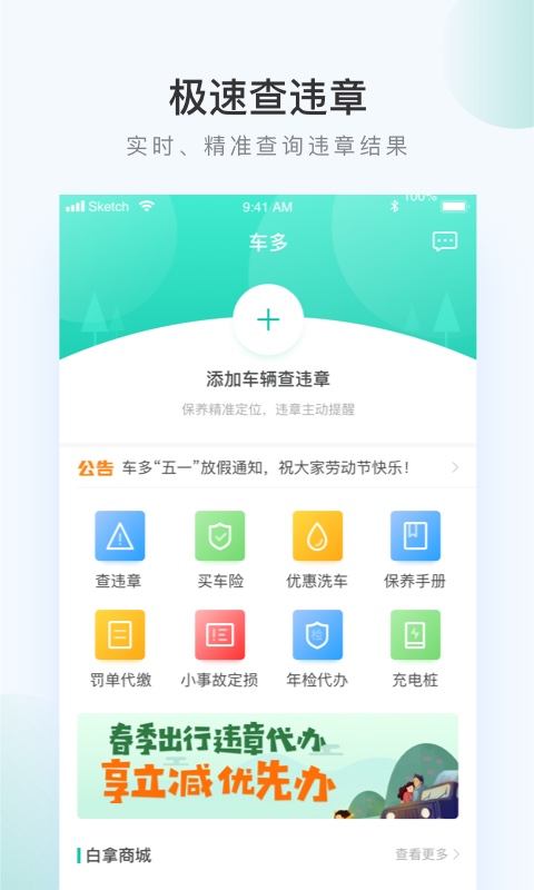 【查违章】全国600+城市交通违章查询,汽车扣分罚款等违章结果一目了然,并提供违章代办服务,是北京、上海、深圳、广州、佛山、天津、杭州等百万车友选择。【专业保养】车多联合全国2.5万家养车门店推出专业保养服务,致力为用户解决机油、靠谱门店和规范服务三大养车需要,得到全国车友的一致好评。