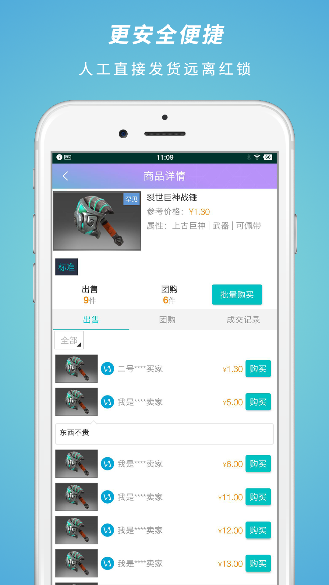 【功能丰富】出售、购买、求购、供应、交易管理,资讯,玩家秀、饰品维基,一应俱全【操控简便】简约设计,应用层级分明,操作简单方便