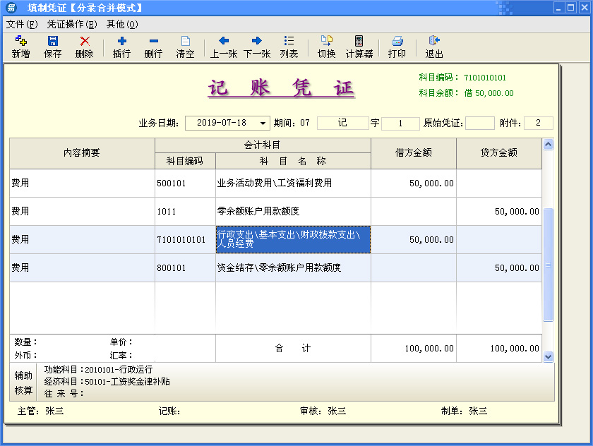 二、强大的凭证填制功能,能根据拼音快速录入会计科目,大大提高了录入效率,还能开启实时科目余额提示、自动填入合计、直接查看科目明细账等功能,以及强大的辅助核算录入,既能使用传统录入界面,也能使用平行记账界面: