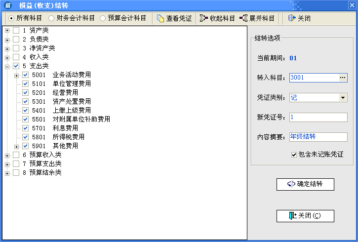 三、年终结转支持选择性的一键自动结转,简单又快捷:
