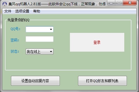打开晨风qq聊天机器人后,界面输入QQ账号及密码即可登陆。