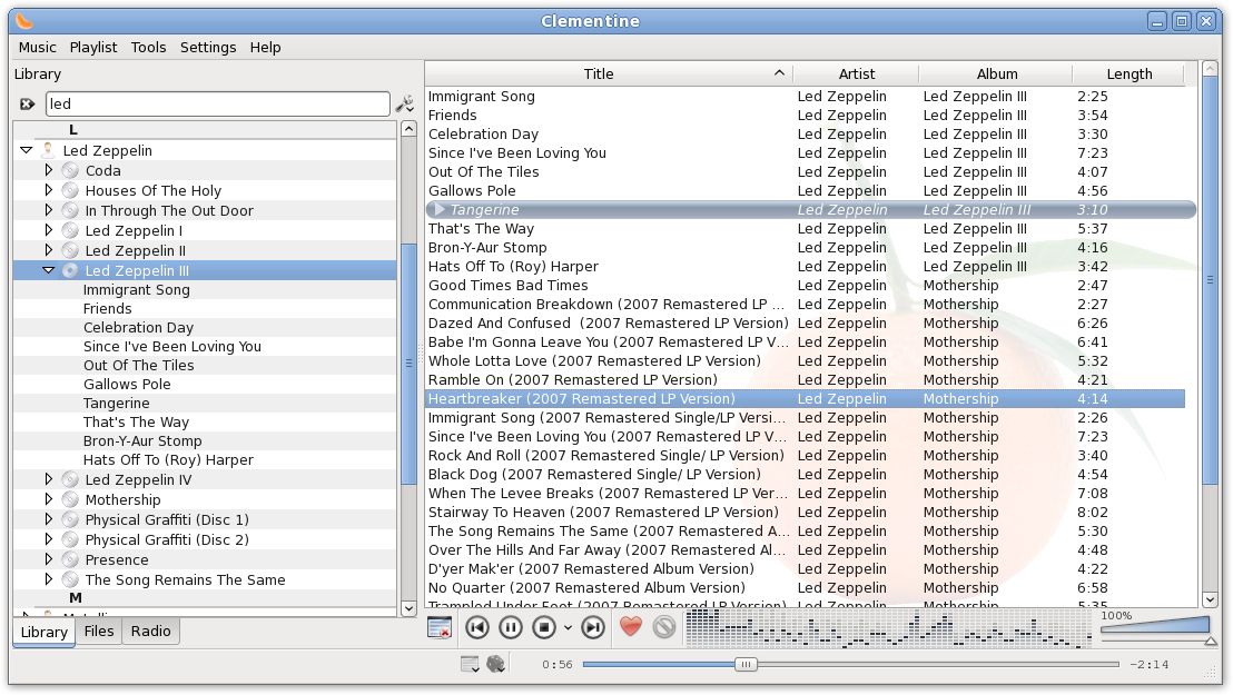 Clementine是一款能够帮助你管理音乐资料库、收听多个广播电台的小型音乐播放器。通过它强大的功能标签系统,我们可以迅速打开音乐文件、广播电台以及储存音乐的文件夹。在音乐资料库中,你能找到软件最有趣的功能标签之一。使用它你可以创建播放列表,使播放器仅播放你喜欢的音乐。你可以通过广播标签打开各种广播电台:Last.fm以及SomaFM。直观的操作界面,让你能够轻松玩转Clementine。不仅如此,Clementine占用的系统资源极少。如果你的电脑需要同时运行其它程序,快来使用Clementine吧,它绝不会拖慢任何程序的运行速度。