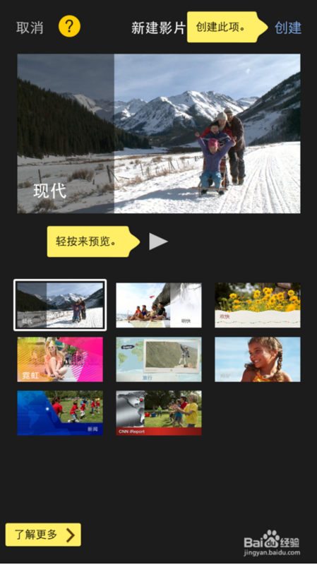 3、点击影片,进入选择主题页面,根据自己喜欢的进入选择主题。可以预览,选好后直接点击创建即可。