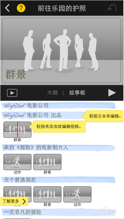 9、大纲编写完毕后可以点击故事板,点击群景或动作,插入自己根据大纲需要插入的视频即照片,之后编写完后保存即可。