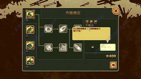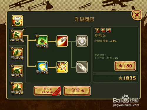 4.除步枪兵之外,每个兵种都有两条不同的路线。先说步枪兵,下路基本没有作用(图中我有点出轻型装甲,只是为了看看满级之后的效果,可以提高攻击范围,无视之)。步枪兵只为过度,所以不需要在上面投入过多的星星,机枪兵升满OK。