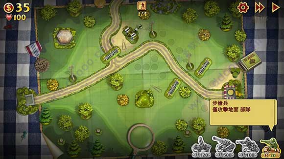3.游戏里有四个兵种,分别是步枪兵、火焰喷射兵、加农炮、防空炮。再介绍各个兵种之前,我们先要知道,在Toy Defense(玩具塔防)里,兵种的升级不合算的,有空位而且地理位置差距不大的情况下,兵海战术的效果优于升级。某个兵种满级时,再投入星星可以提升被动。