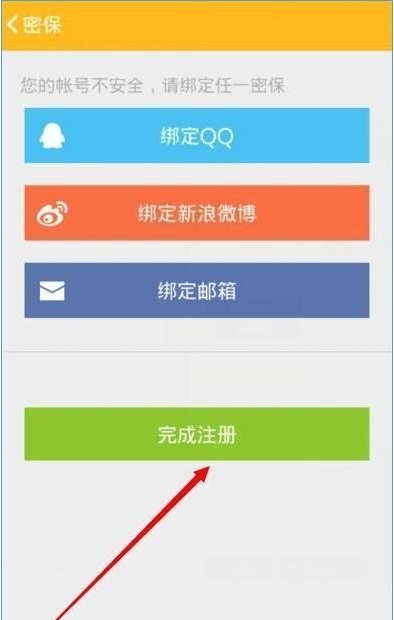 4、你可以选择绑定qq或者微博,不绑定的话直接点击完成注册即可。