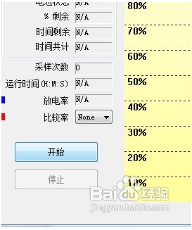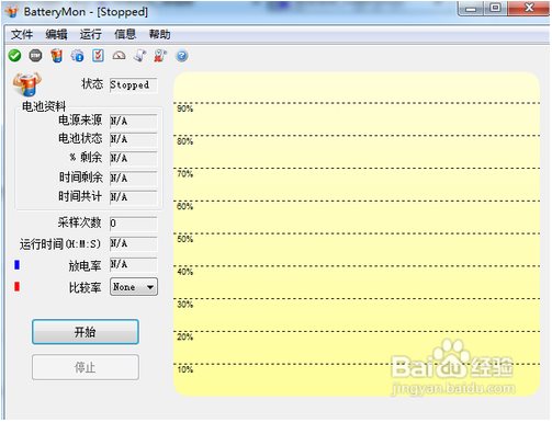 2、你会看到软件的上面显示“stopped”说明软件还没有被运行,点击下面的“开始”按钮就开始运行软件,你会看到你的电池目前的运行状况