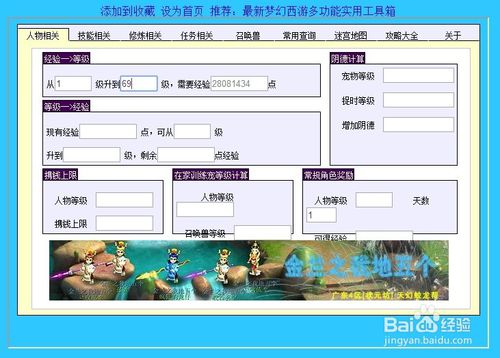 常用查询:包括最新奇经八脉模拟系统,科举试题,三界答题,法宝模拟,元宵灯谜,诗中仙,子女教导,四门绝阵,帮派迷宫,三界书院,钓鱼查询,NPC查询,聊天表情,梦幻卡牌,技能花费,传说地点,等数据查询功能。