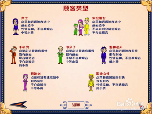 美女餐厅游戏里设计了各式各样不同的人。如果你已经玩到了很高的级别,就会遇到各式各样的顾客,但总体上顾客没有绝对的好,也没有绝对的坏。如果是耐心度消耗很快的顾客,用餐的速度也快,耐心很好的顾客,用餐的就会很慢,在玩的时候,要根据顾客的性格决定是否让其排队或等餐。