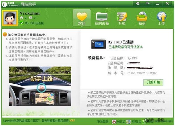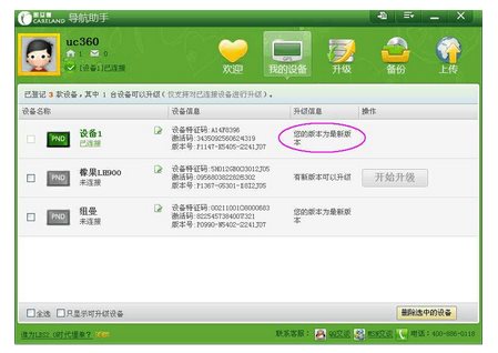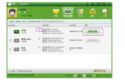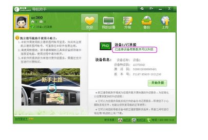 A:设备连接上助手之后,导航助手会自动识别设备中导航的版本,并在“欢迎”界面及“我的设备”界面给出升级提示,如下图所示: