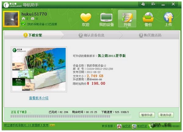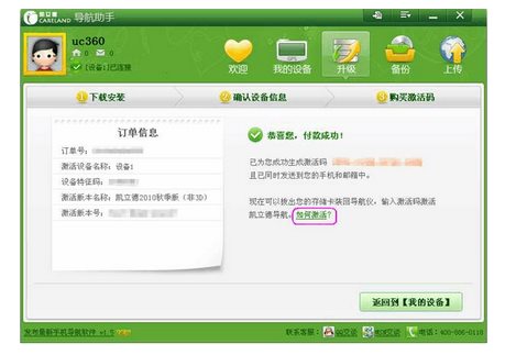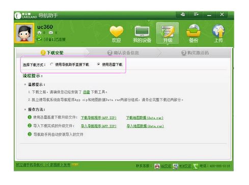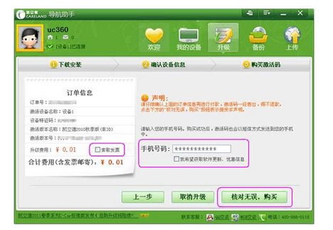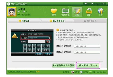 导航升级分为三个阶段:下载安装、确认设备信息、购买激活码。