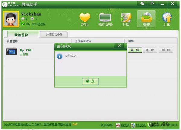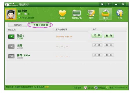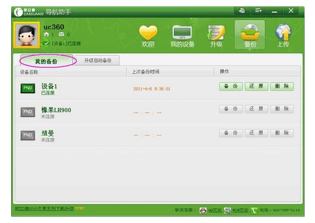导航设备或者装有导航软件的存储卡连接电脑后,在「凯立德导航助手」菜单栏点击「备份」,进入设备的备份/还原界面。