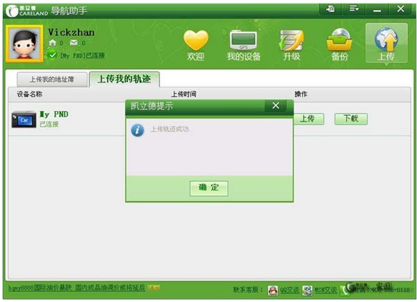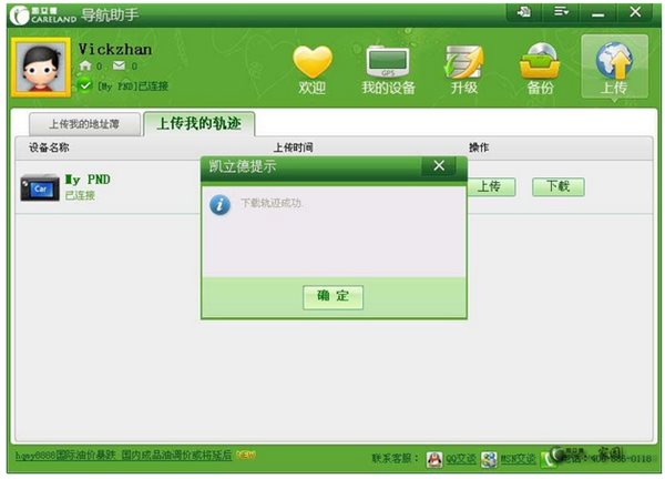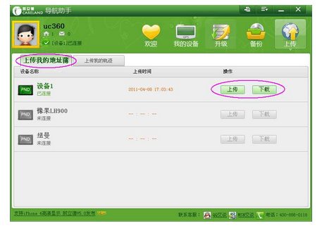 点击「上传」,将导航设备中的地址簿/轨迹上传到凯立德家园网; 点击「下载」,可从凯立德家园网下载地址簿/轨迹到导航设备。
