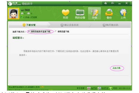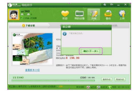 点击「点击下载」,导航助手将一键下载和安装升级文件。 因升级文件较大,下载时间可能较长,请耐心等候。下载期间,如出现断网现象,可在网络恢复正常后,重新点选下载。