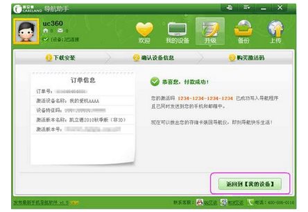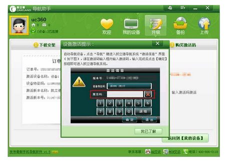 请记下“激活信息”界面的设备特征码,并把已完成升级文件安装的设备或存储卡重新插回电脑,在「凯立德导航助手」的“确认设备信息”界面输入您刚才记下的特征码。