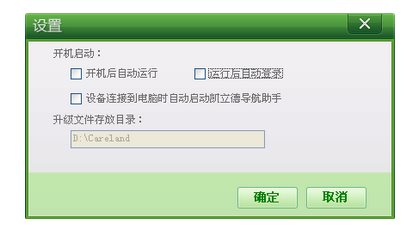 勾选“开机后自动运行”,下次电脑启动后,将自动最小化运行「凯立德导航助手」; 勾选“运行后自动登录”,下次启动导航助手,将自动登录账号信息; 勾选“设备连接到电脑时自动启动凯立德升级助手”,下次设备与电脑连接,系统将自动运行导航助手,方便用户使用。 设置界面中,还显示了升级文件的存放目录,如:D:\careland(该目录默认在可用空间最大的磁盘的根目录下)。