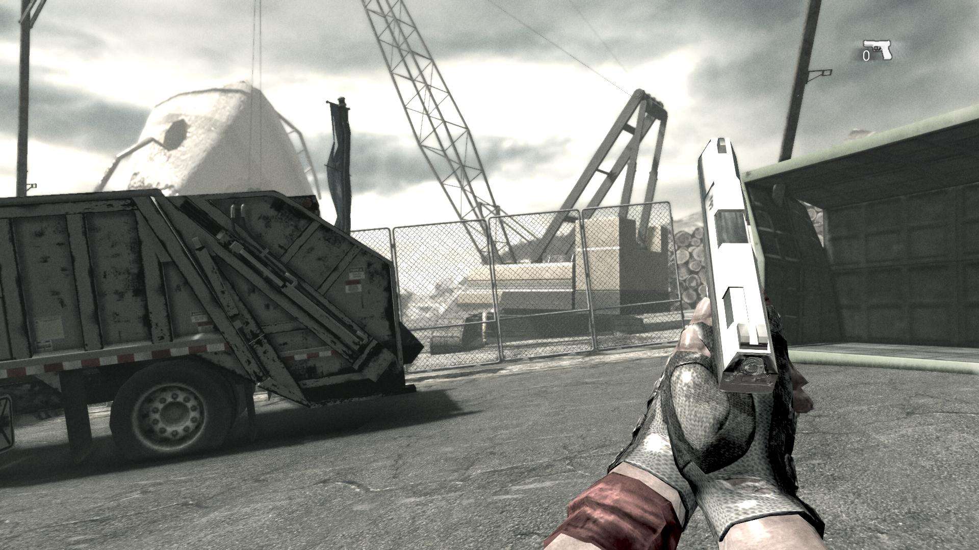 再来说说音乐,虽然没有琅琅上口的曲调,但是整体上音乐的运用和出现的场合都是恰到好处并且恰如其分的,枪声,走路声,吵闹呼喊声,让人无可挑剔。特别要说明的是,随着你体力条的减少,背景音乐会越来越激烈,配合着强烈的节奏感,尽管周围一个人都没有,但是这音效足以让人在整个游戏流程中都在紧张中度过,令人窒息的音效加强了游戏的冲击力。