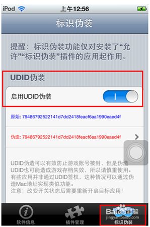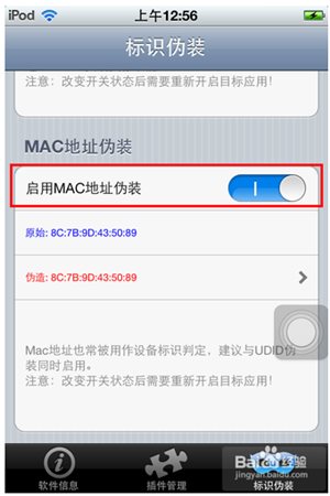 然后点击页面额最下方有个“标示伪装”。将“启用UUid伪装”和“启用mac地址伪装”两个功能的开关置为打开状态。这是为了让内购的时候不至于被苹果方面检测而封号。