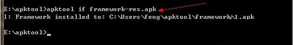 4、 接着输入:apktool if framework-res.apk(回车),这一步是加载框架,反编译系统程序时很必要。但是我这个版本可以省略这一步的,为安全起见,我顺便也做了这步