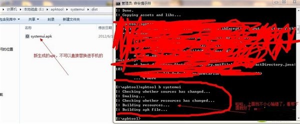 8、 回编译,CMD窗口输入apktool b systemui(回车)出现下面画面,你就有希望成功了。