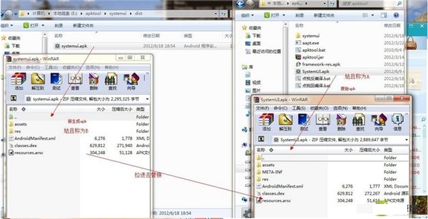 9、 最后,很重要的一步,你看不到自己卡M了不要怪我哈。这里将原始apk称为A,新生成的apk称为B。以方便下面叙述。将A,B均用winrar打开,不要解压。