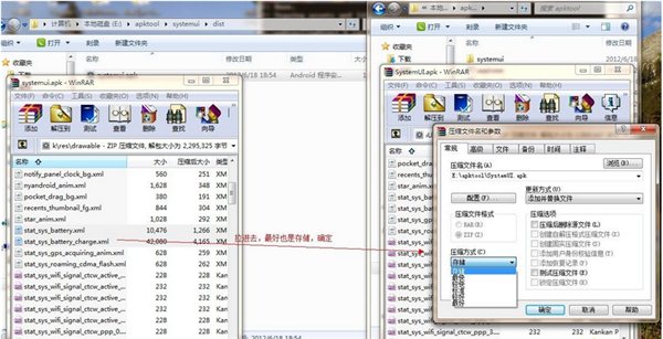 第一,(还有第二哦)将B中的resources.arsc文件拉到A中替换,压缩方式改为存储。切记