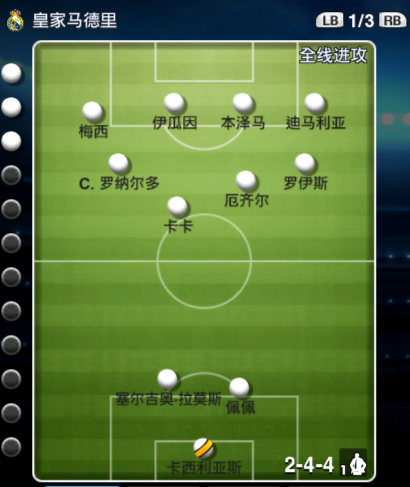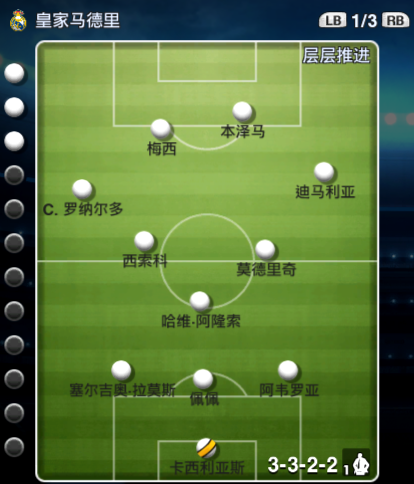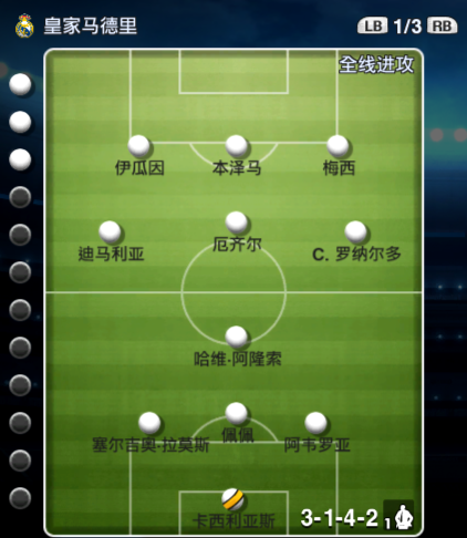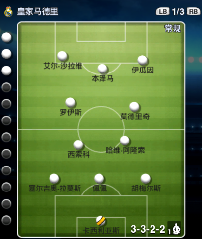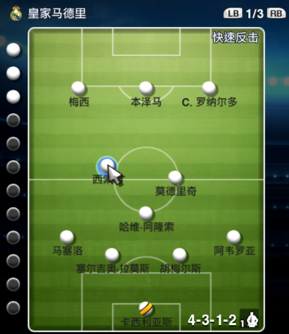 是如果你的边路球员状态低迷的是时候,可加大中前卫的投入。也可以变为3-2-2-3。“西索科”长传弱爆,但短传一流,让他突前是为了利用他的抢断,然后短传直塞给前锋。“梅西”和“C罗”一左一右顺足,更多是让他们下地传中,或者拿球吸引电脑防守球员,进球核心还是“本泽马”。